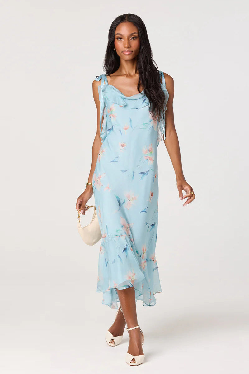 Cascading ruffles and adjustable shoulder ties give this floral midi dress romantic movement. The scoop neckline and tiered hem create an effortlessly feminine silhouette that's perfect for warm-weather occasions.