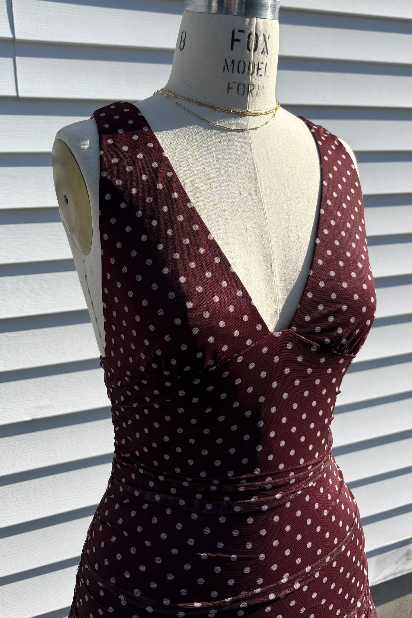 This sophisticated V-neck dress features an elegant dot pattern with strategic ruching that flatters your silhouette. The ruched detailing creates dimension and movement, while the classic V-neckline offers a refined, versatile look suitable for both casual outings and dressier occasions. The dot print adds visual interest without overwhelming the design. Perfect for those seeking a polished piece that combines timeless style with contemporary tailoring.