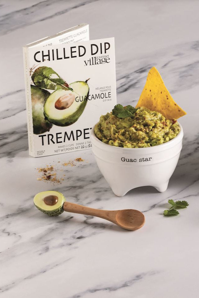 3-piece set. Ceramic guacamole bowl. Comes with wooden spoon with hand-painted avocado ceramic handle and Gourmet Village guacamole seasoning mix.
