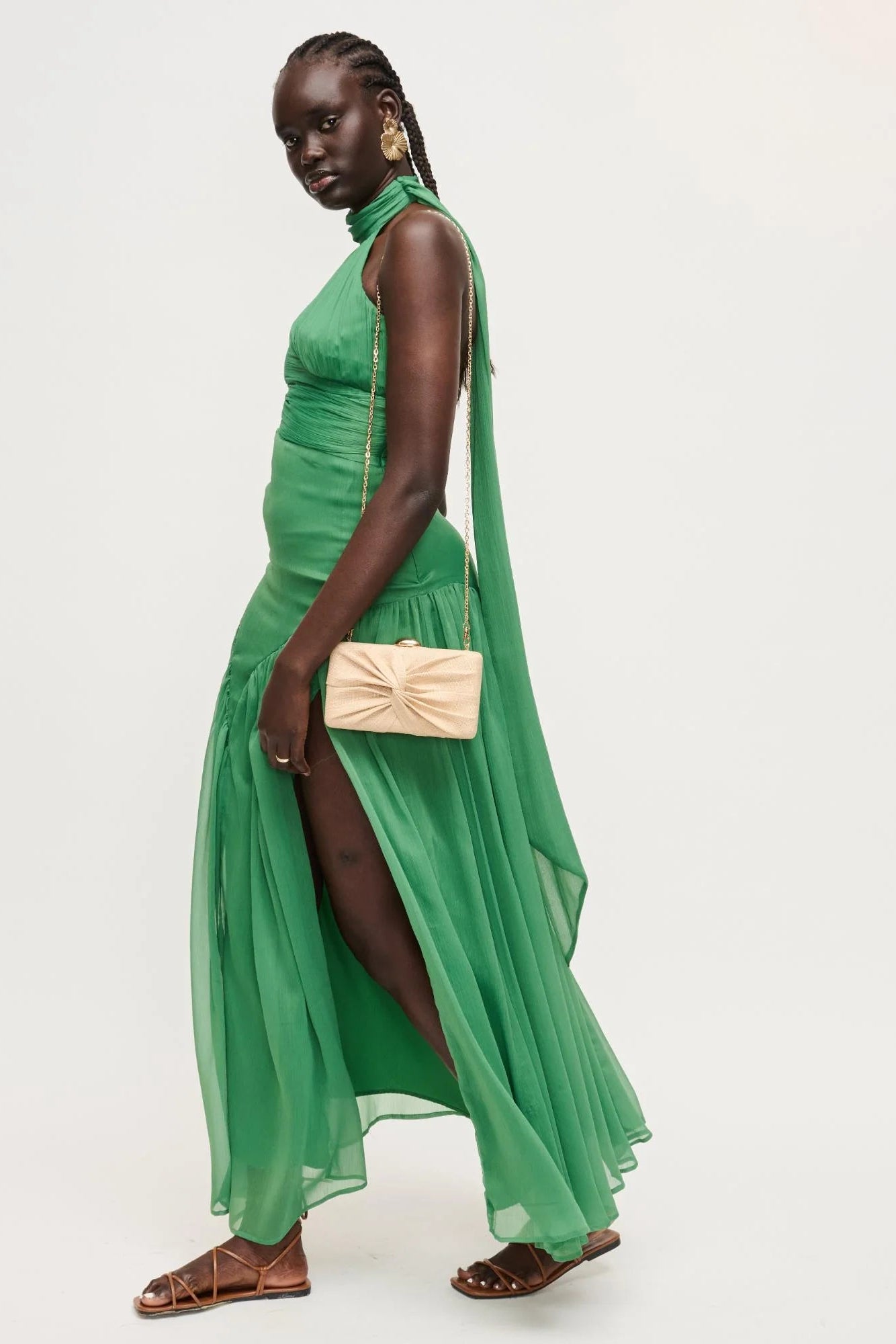 Serenity Evening Bag — knotted-pleat hard-case clutch. Structured silhouette, luxe woven texture, and a sculptural knot-front detail that complements formal looks. Removable chain strap converts from shoulder to handheld. Secure snap-top closure, compact interior fits phone, cards, lipstick. Vegan-friendly materials and polished hardware make it an ethical, modern choice for weddings, cocktail nights, and date evenings.