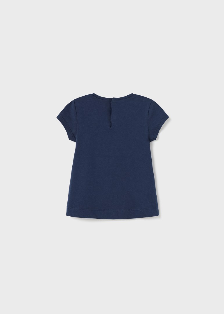100% cotton. Short sleeved T-shirt for baby. Round neckline. Snap button fastening on the back to allow the garment to be put on easily. Patterned design.