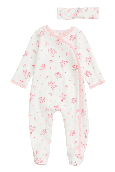 Delight in the charm of our Floral Blossom Sleeper, a beautifully crafted 2-piece set designed for your little one's comfort and style. This ivory footed sleeper features a delicate floral pattern, enhanced by elegant ruffle details that add a touch of sophistication. The convenient snap closure ensures easy dressing and diaper changes, making it a practical choice for busy parents. Accompanying the sleeper is a matching bow headband, completing the adorable ensemble. Made from 100% cotton, this set promises softness and breathability, perfect for your baby's sensitive skin.