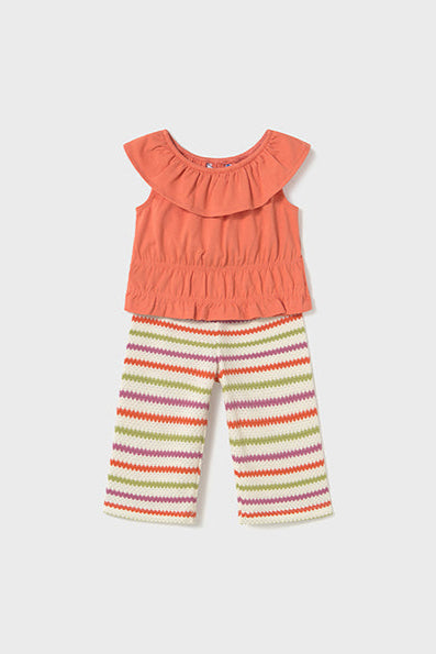Get your little fashionista ready for any occasion with our adorable mini girl ruffle tee and crochet pant set! She'll be the trendiest kid in town with this stylish and comfortable outfit. Perfect for playdates, family outings, or just lounging around in style. Your little one will love the ruffled details and you'll love how easy it is to dress her in this cute combo!