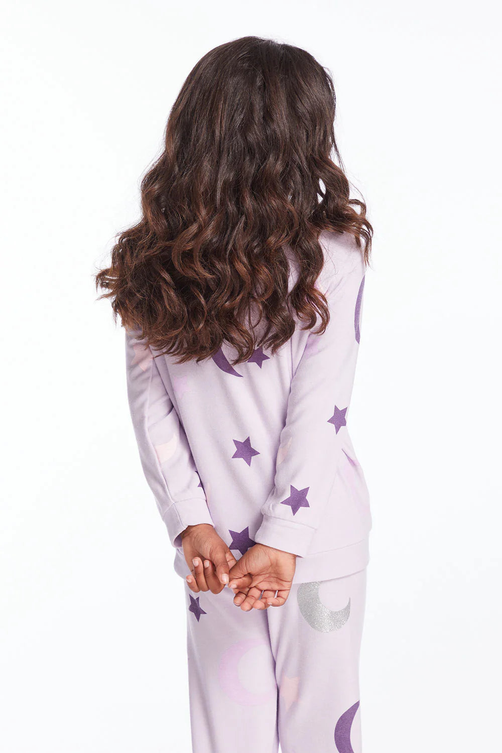 With a sweet lavender backdrop and playful light purple stars and moons, this cozy long sleeve will have her feeling like she hung the moon.