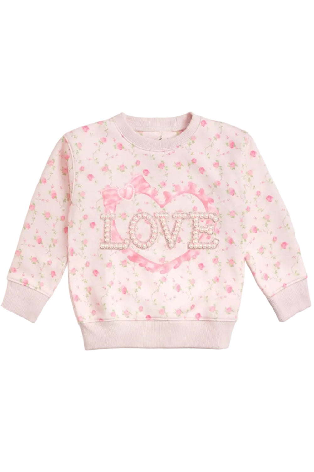 This adorable pink floral sweatshirt features a sparkling “LOVE” patch framed by a satin heart and bow, adding the perfect touch of sweetness to any cozy outfit.