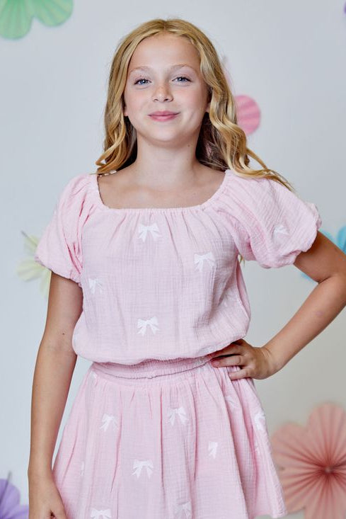 Lightweight and breezy, this girls' gauze bow top features a soft, breathable fabric perfect for warm weather play. The charming bow detail adds a sweet touch to any outfit, while the relaxed fit ensures all-day comfort. Ideal for layering or wearing solo, this versatile piece transitions effortlessly from casual days to special occasions. Pair with matching skort!