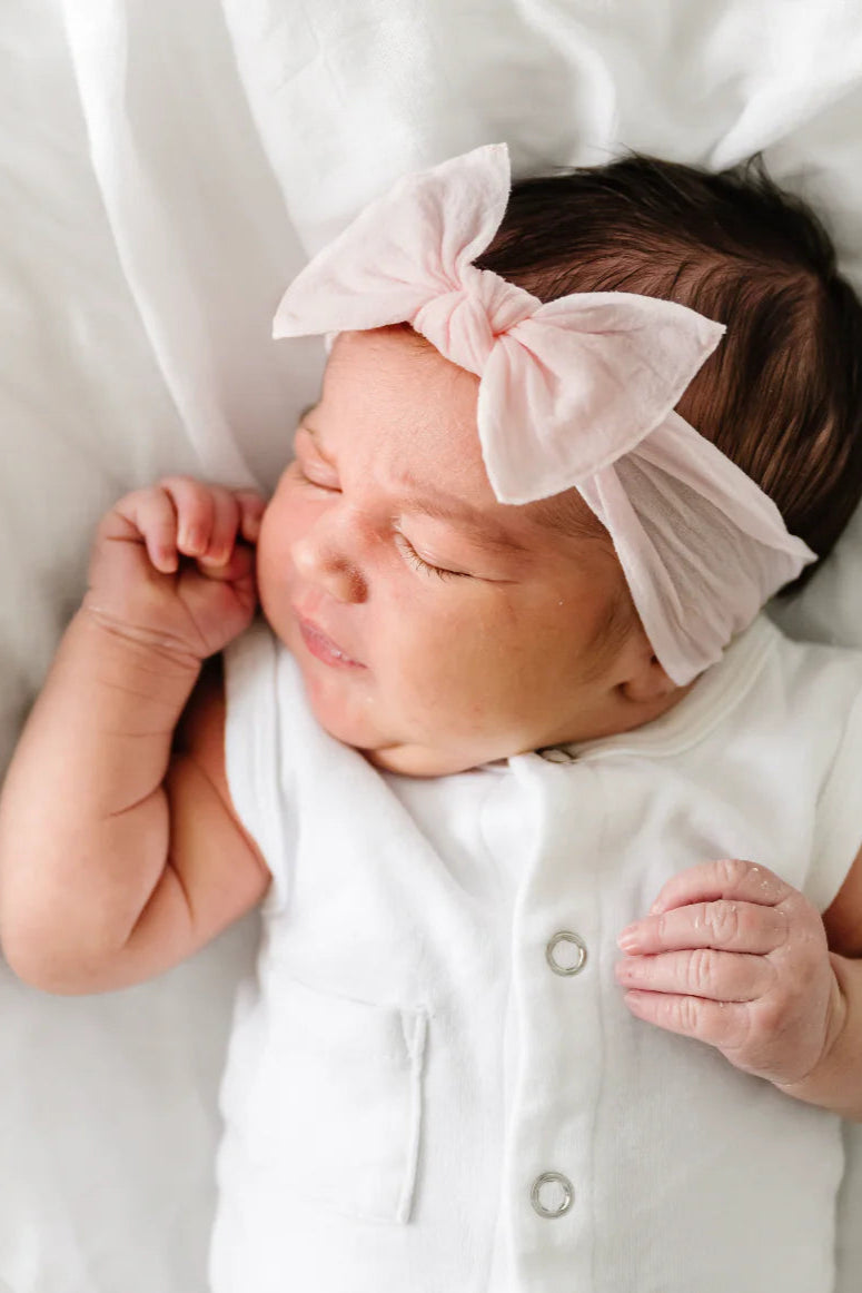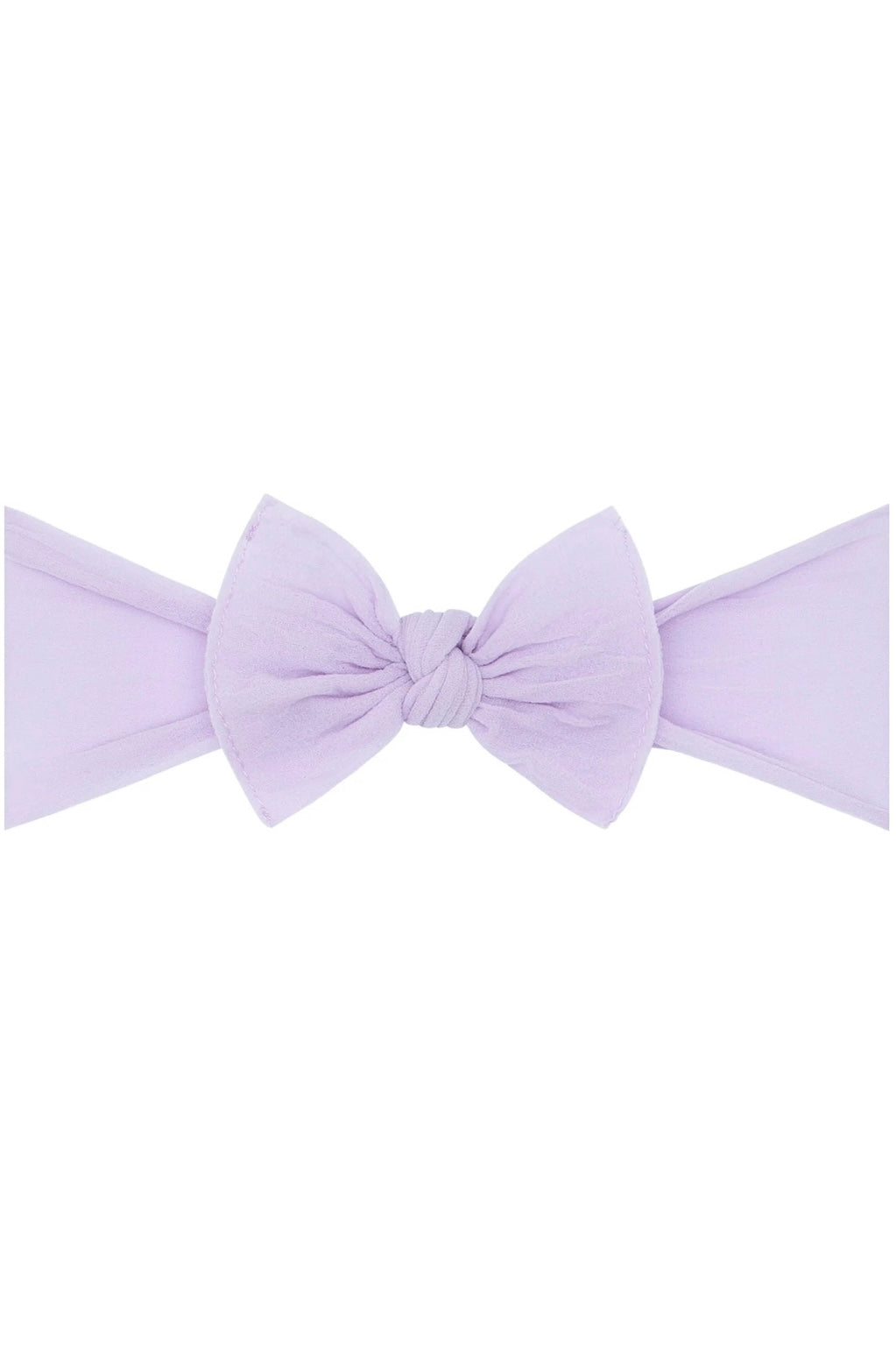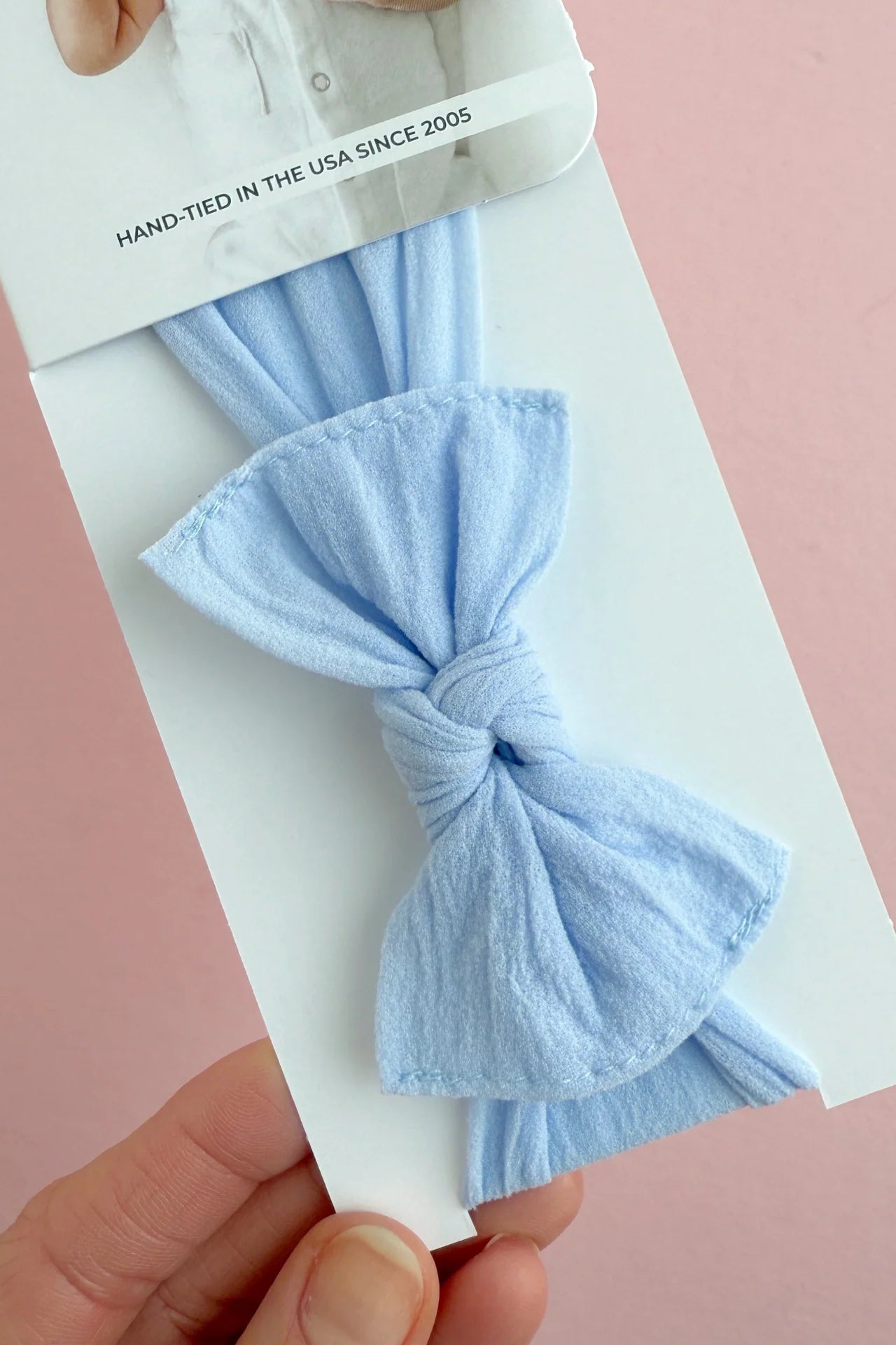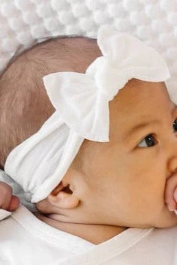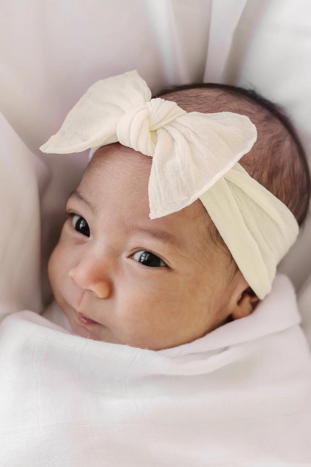 These headbands are sized for preemies and small newborns up to 10 lbs. The headband is sewn at a 5" diameter (10" circumference), keep in mind that measurement is before it stretches. The bow measures approximately 3" across. The exposed stitching detail and a raw edge is signature Baby Bling! This style is sewn in two pieces and can be taken apart for hand washing or to mix-and-match. The Itty Bitty Knot material is a soft nylon, produced to our specifications, in the USA. Each headband is hand sewn and tied by women in our local community. Due to the nature of small-batch production color and sizing can vary slightly.