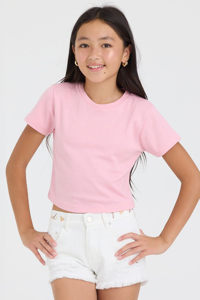 Soft ribbed knit tee designed for everyday comfort. Features a classic crew neckline and fitted silhouette that flatters while allowing easy movement. Perfect for layering or wearing solo, this versatile piece pairs effortlessly with jeans, skirts, or leggings. Durable fabric holds its shape wash after wash, making it a reliable staple for any girl's wardrobe.