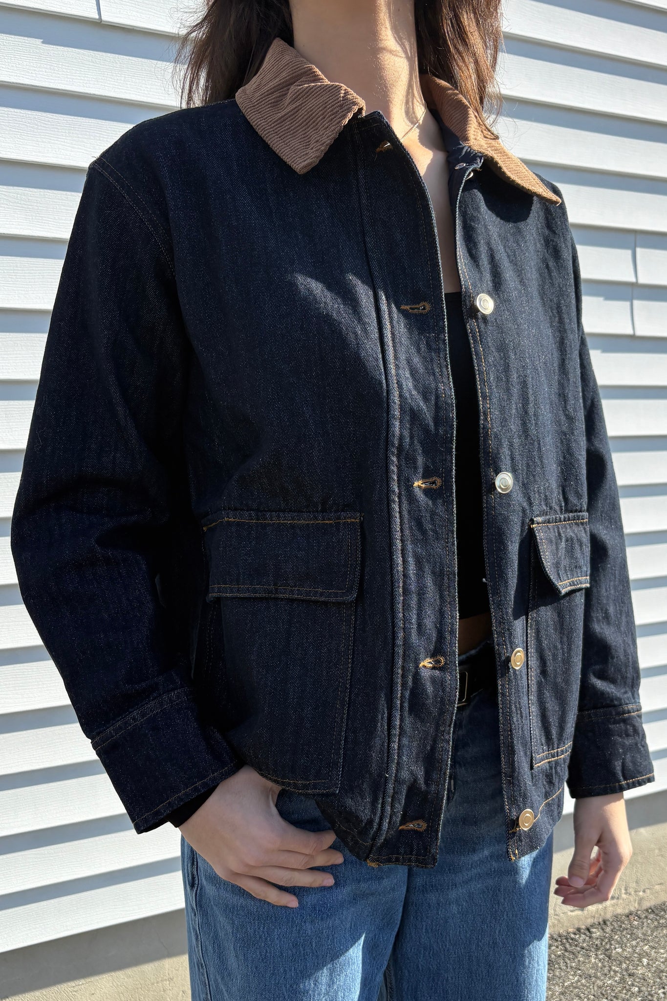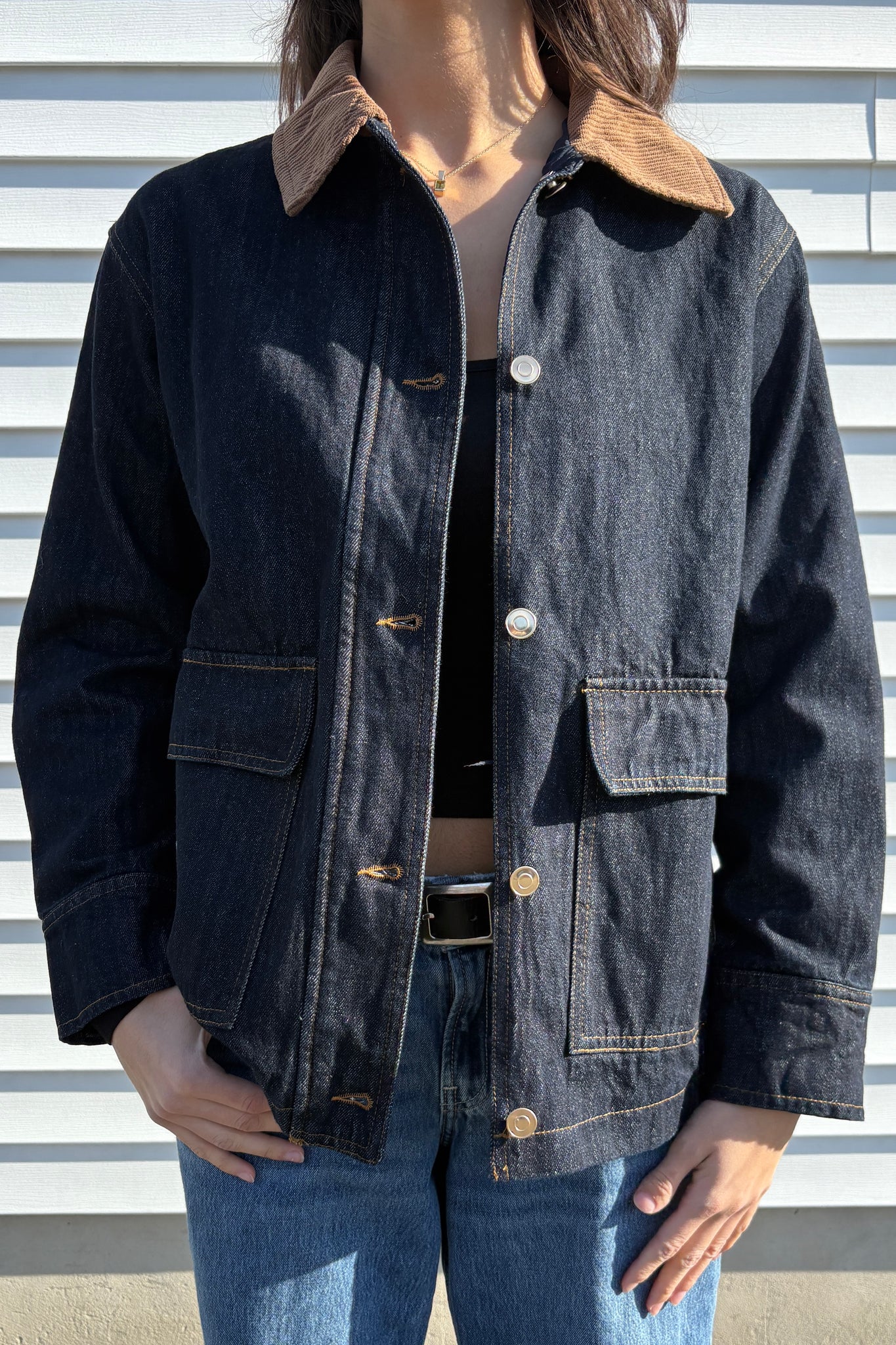 Layer up with vintage charm in this corduroy collar denim barn jacket. The classic denim body pairs perfectly with a cozy corduroy collar for a look that's equal parts rugged and refined. Whether you're heading to the farm or the coffee shop, this jacket brings effortless style and comfort to any outfit. A timeless piece that works as hard as you do.