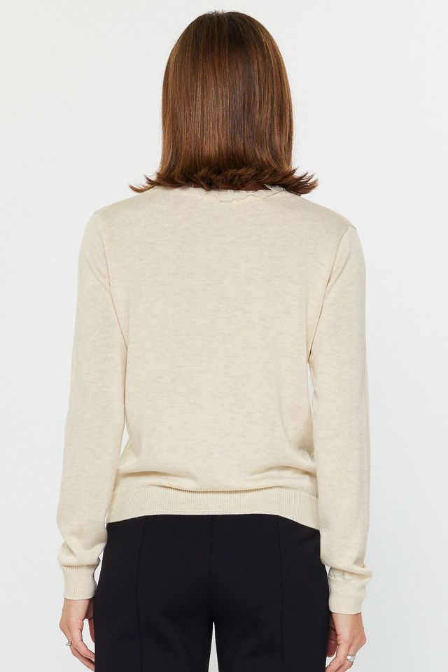 Elevate your everyday wardrobe with this refined v-neck sweater, featuring delicate lace trim that adds an unexpected touch of elegance. The flattering neckline creates a graceful silhouette, while the intricate lace detailing at the edges brings dimension and sophistication to a timeless piece. Perfect for layering or wearing solo, this sweater transitions seamlessly from office to evening, offering versatile style with understated luxury.