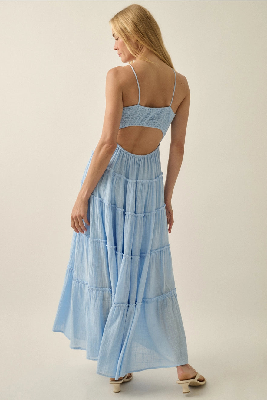A solid cotton gauze maxi dress with the following features: Plunging neckline. Gathered bodice with keyhole and tie detail. High waist. Sleeveless with spaghetti straps. Low back with elastic smocking and waist cutout. Elastic-back waist. Tiered ruffle skirt with ruffle trim. Partial thigh length lining. Ankle length. Relaxed fit.