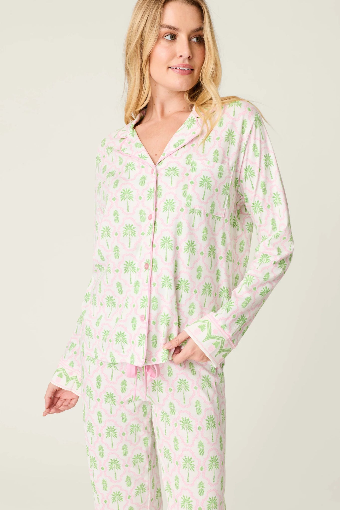 Women’s ivory long sleeve pajama shirt crafted in cotton-modal jersey with green and pink palm tree and pineapple print, featuring a button-front design, notch collar, chest pocket, and contrast piping.