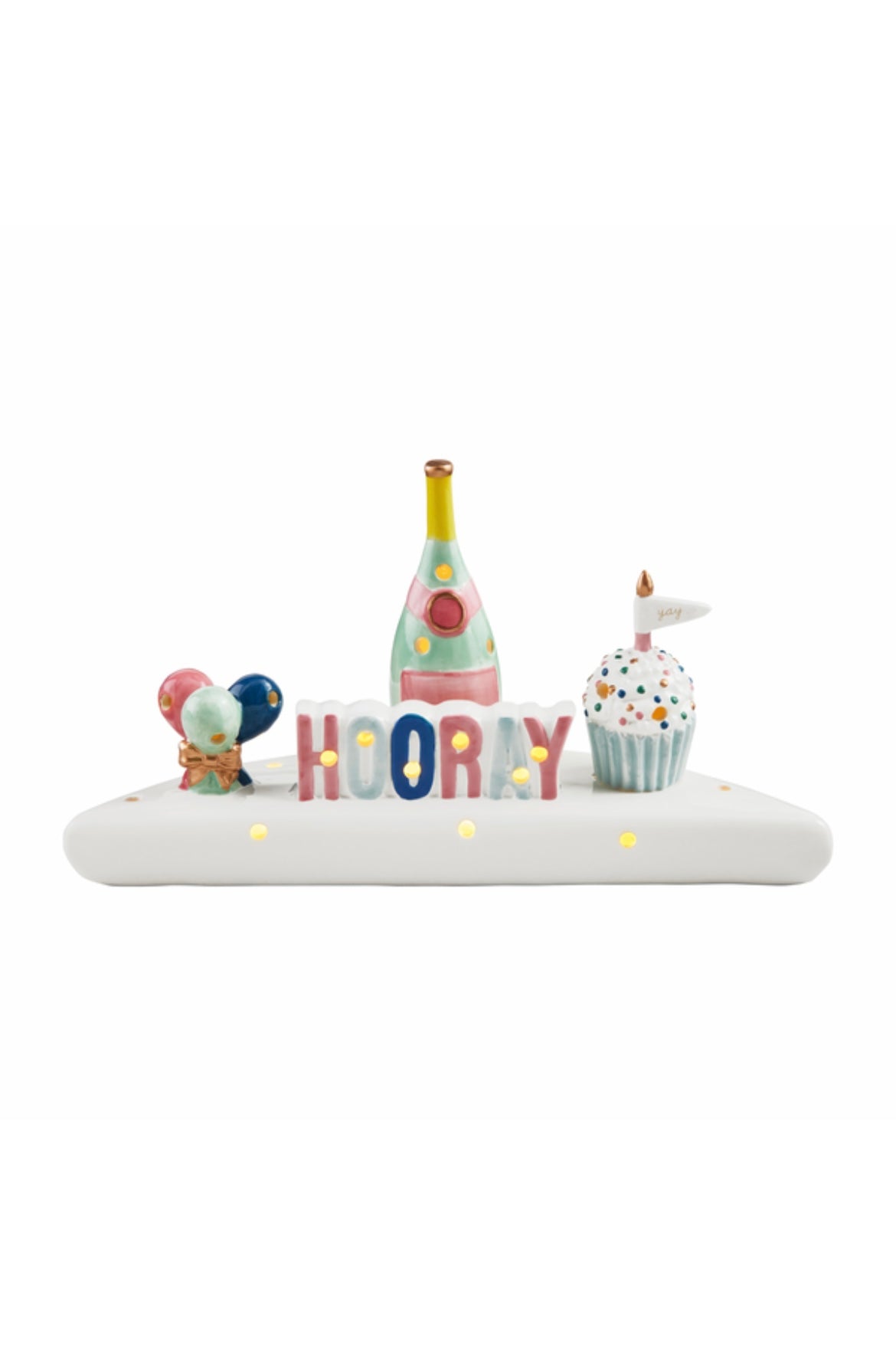 The Large Light-Up Celebrate Sitter is a stunning decorative piece that adds a touch of elegance and festivity to any space. Crafted from high-quality dolomite, this hand-painted ceramic sitter features intricate detailing that showcases exceptional craftsmanship. The built-in LED lights illuminate the scene, creating a warm and inviting ambiance. Measuring 4 1/4" x 10 1/4", it is the perfect size to make a statement on a mantel, shelf, or tabletop. With the convenience of an included battery, this piece is ready to enhance your decor with its charming glow.