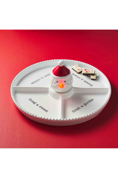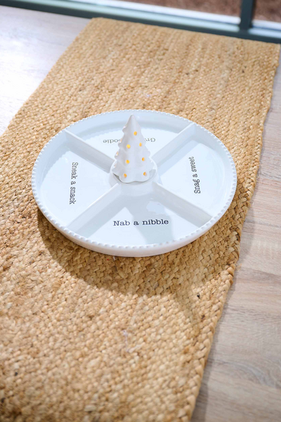 Our Divided Serving Tray is the perfect companion for your snacking needs. Crafted from high-quality ceramic, this tray features four convenient sections, each adorned with a unique sentiment. With phrases like "Nab a nibble," "Sneak a snack," "Grab a goodie," and "Snag a sweet," you'll always find the perfect spot for your favorite treats. Made from durable dolomite, this tray measures 12 1/4" in diameter and is dishwasher safe for easy cleanup. For an added touch of charm, consider pairing it with our Mud Pie Decorative Sitter in the center. Elevate your snacking experience with our versatile and stylish Divided Serving Tray.