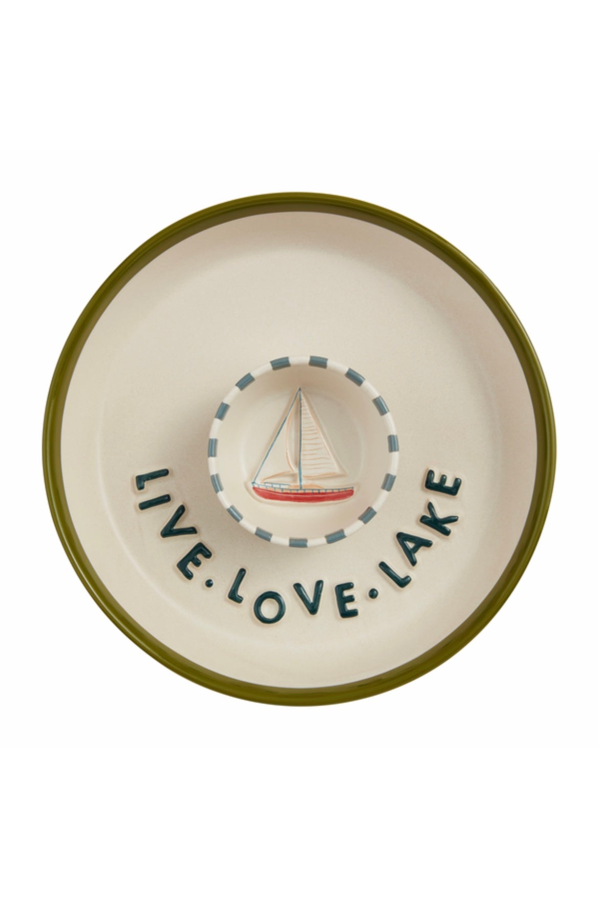 Live Love Lake Chip And Dip Server is a beautifully crafted hand-painted stoneware piece that adds a touch of elegance to any gathering. This chip server features an attached center dip bowl, making it perfect for serving your favorite snacks and dips in one convenient dish. The server is adorned with chunky textural details that enhance its visual appeal, making it a standout addition to your tableware collection. Measuring 2 1/4 inches in height and 10 1/2 inches in diameter, this durable stoneware server is ideal for both casual and formal occasions, offering both functionality and style.