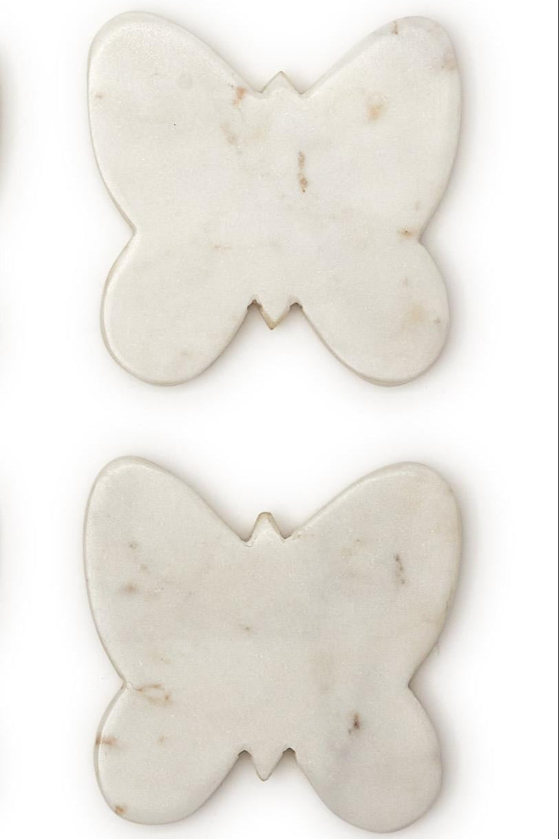 Slices of white marble shaped as butterflies makes this coaster set so special. Made by skilled craftspeople, these coasters protect surfaces from heat and condensation. Tied together with twine, the quartet is ready for gift giving.