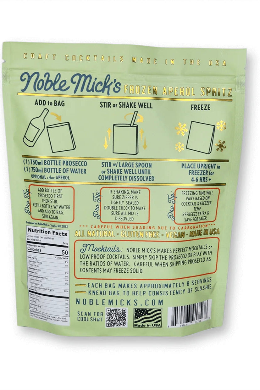 Frozen Cocktails don't get easier than this! Each bag makes 8 servings. No blenders ever! Simply add 1 bottle of Prosecco and 1 bottle of water (optional splash of Aperol) shake or stir and throw in the freezer. 100% all natural ingredients and perfect to share with friends and family at your next party. Cheers from Noble Mick's