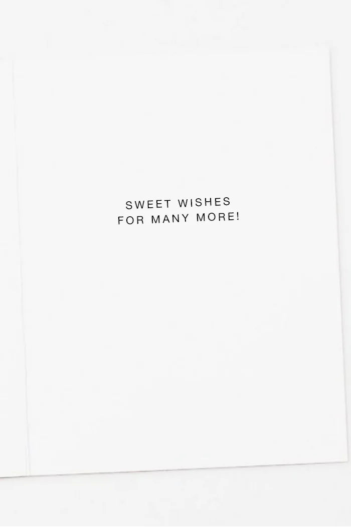 A2 Size (4.25 x 5.5 inches folded). Inside greeting: "SWEET WISHES FOR MANY MORE!" Printed on premium recycled paper. Paired with a recycled white envelope. Packaged in cello.