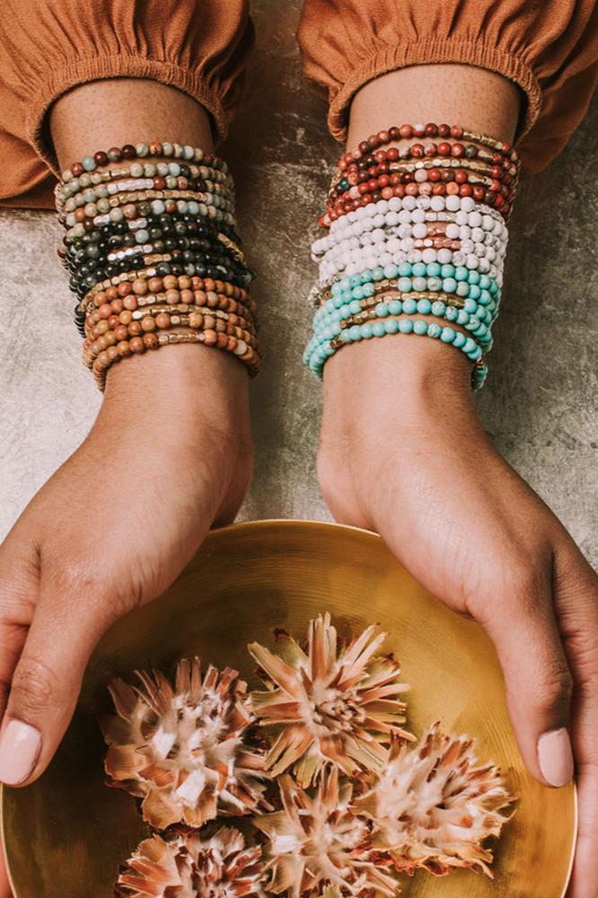 Tap into the energies of the earth. Semi precious gemstones adorn wrist & neckline. Effortlessly converts from bracelet to necklace. Can be wrapped 4-5 times as a bracelet and 1-2 times as a necklace.