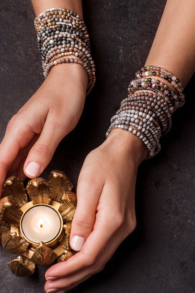 Tap into the energies of the earth. Semi precious gemstones adorn wrist & neckline. Effortlessly converts from bracelet to necklace. Can be wrapped 4-5 times as a bracelet and 1-2 times as a necklace.